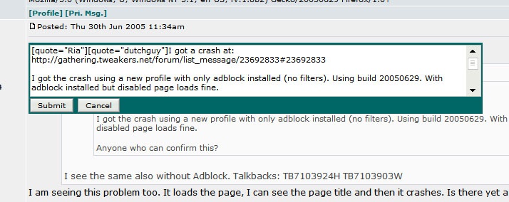 Ik was daarnet een reactie aan het typen op de Forums van MozillaZine en ik zag daar een leuke feature, te weten de quickedit. Via een knopje komt een invoerveld tevoorschijn waarin de reactie geëdit kan worden. Hiervoor hoeft dus niet een speciale editpagina geladen te worden, maar kan vrijwel direct de reactie gewijzigd worden. Zie het screenshot voor hoe het eruit ziet.