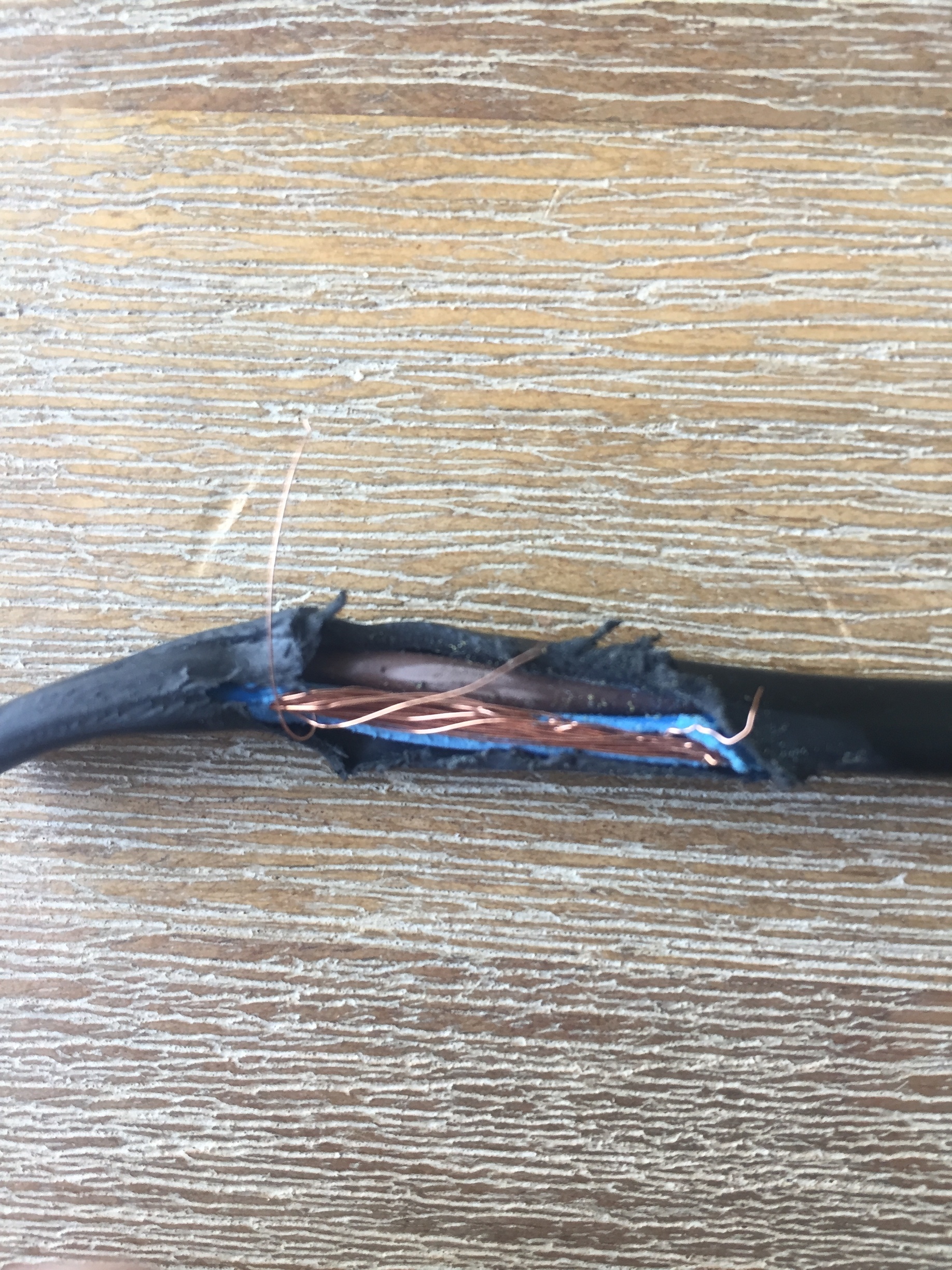 Vandaag weer wat meegemaakt: Kruimel had zich op weten te hangen aan het snoer van een bureaulamp. Tijdens het losmaken kwam ik er net op tijd achter dat de mantel van het 230V snoer compleet was weggeslepen