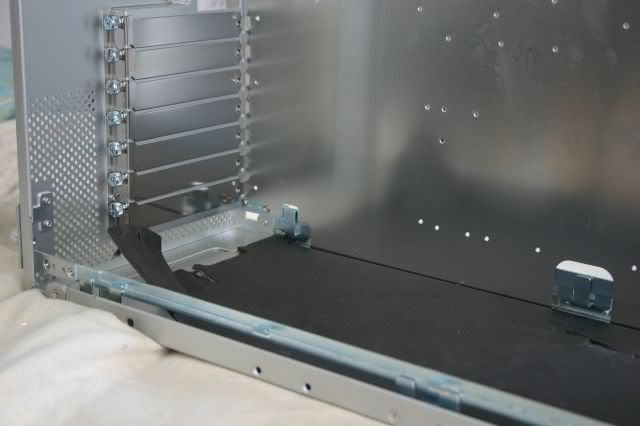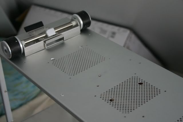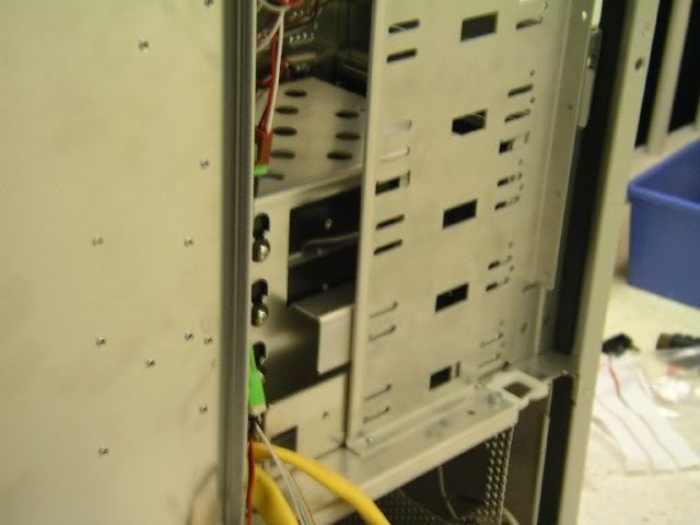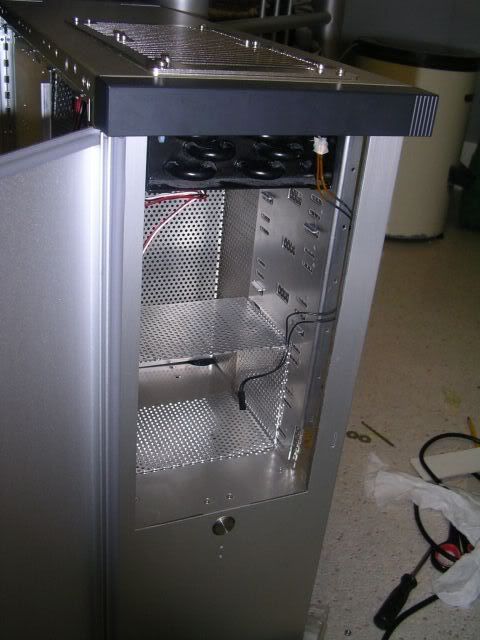 Ik heb gaten in de onderkant geboort om de prometeia op vast te zetten en de popnagels van de harddisk rekjes doorgeboort zodat de prom erin past. Met het juiste boortje en een accuboor gaat het vrij vlot.
