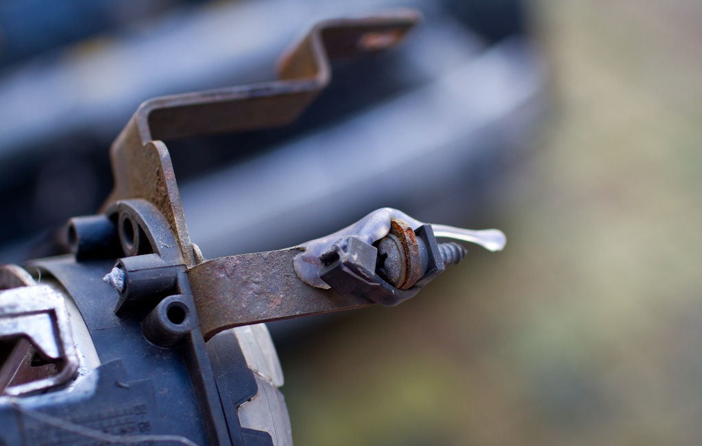 Close-upje van de schroef en de kit. Die schroef zat er voor-jan-met-de-korte-achternaam in, de kit hield 'm daar vast. En waarom die tie-wrap daar zit? Echt geen idee.
