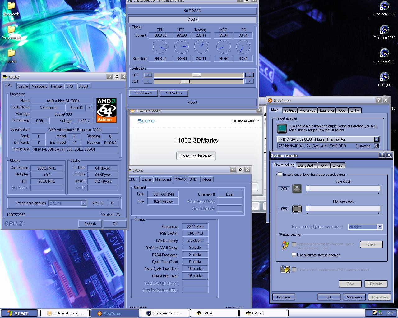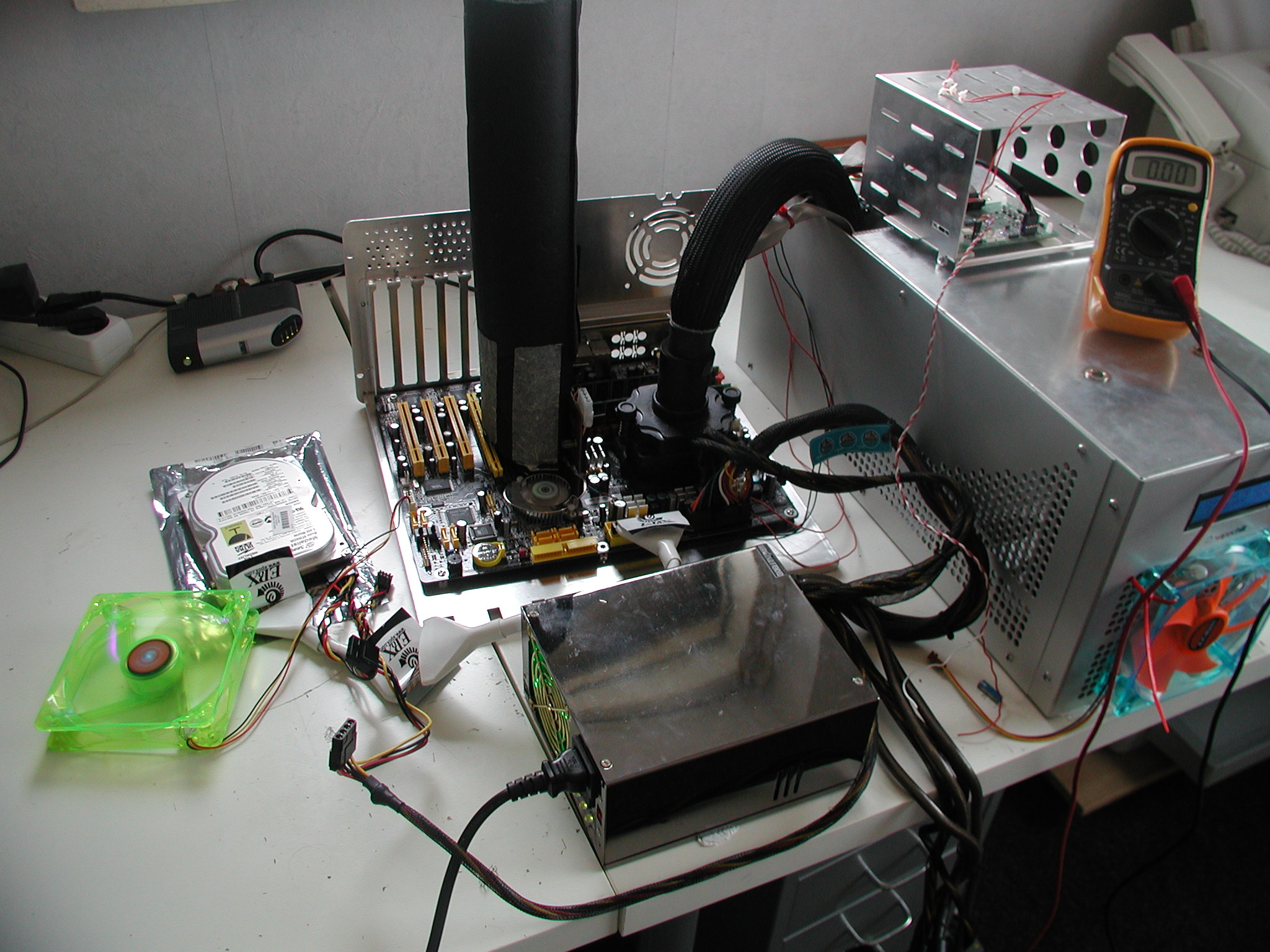 ) Aangezien de Athlon64 op dat moment pas net uit was kwam ik voor nogal wat problemen te staan. De HTT van die Asus K8V kreeg ik niet boven de 222MHz uit omdat PCI/AGP locks ontbraken. Hierdoor was de uiteindelijke OC nogal brak. Maar natuurlijk waren er een paar trucjes om dit te omzeilen. Het probleem boven de 222MHz was dat m'n HDD corrupt raakte, door deze te vervangen door een IDE schijf op een losse PCI IDE controller kon ik door naar de 250MHz HTT. Uiteindelijk kreeg ik de CPU (na m'n eerste echte vmod uitgevoerd te hebben) stabiel op 2420MHz met het mem 1:1. Met deze setup ben ik ook nog naar de 2e UFO geweest bij petervandamned thuis. Hier is de HAEG cascade gebruikt om het systeem nog wat harder te laten gaan. Maar aangezien we te lui waren om het ding te isoleren (en omdat het mobo toch voor geen meter liep) mislukte dit een beetje. Het condens liep gewoon met druppels achter over het mobo.