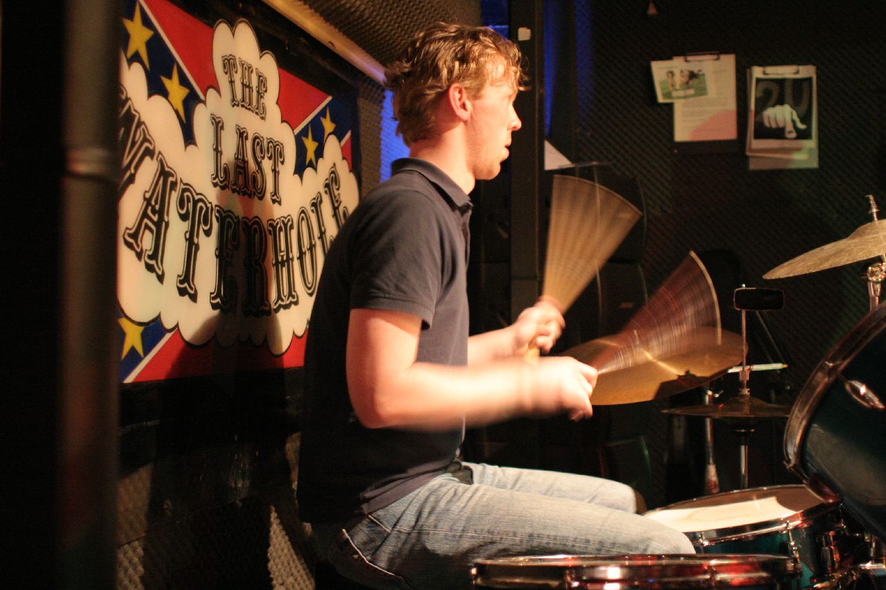 Alleen, zoals velen misschien wel kennen, kon deze drummer ook een drumstokje tussen zijn vingers draaien en we hebben een aantal pogingen gewaagd om dit goed op foto vast te leggen. Dus alles stil op beeld, behalve de stokjes. Maar wat we ook probeerden, we kregen het niet voor elkaar. Niet met flitser, niet zonder flitser, lange sluitertijd, korte sluitertijd, etc etc.