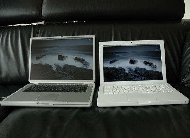 13,3" MacBook naast 15" PowerBook (Titanium), De (buiten)afmetingen schelen biet eens zo veel, maar het schermoppervlak beslist wel.