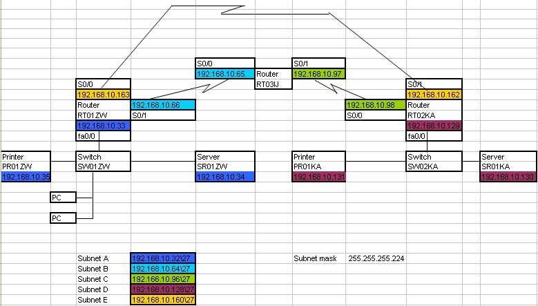 Maar bij het subnet 192.168.10.32 zie je maar 1 weg. Waarom is dat zo?