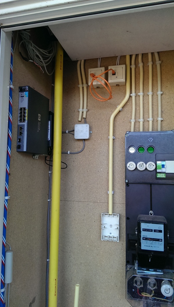 Verder een stopcontact bijgemaakt in de meterkast en een switch geplaatst. De 2 uplink poorten zorgen voor een gigabit-verbinding naar de woonkamer-switch en mijn PC, een 100mb-poort heb ik gebruikt voor de printer waardoor dat nu een echt onafhankelijke netwerkprinter is.