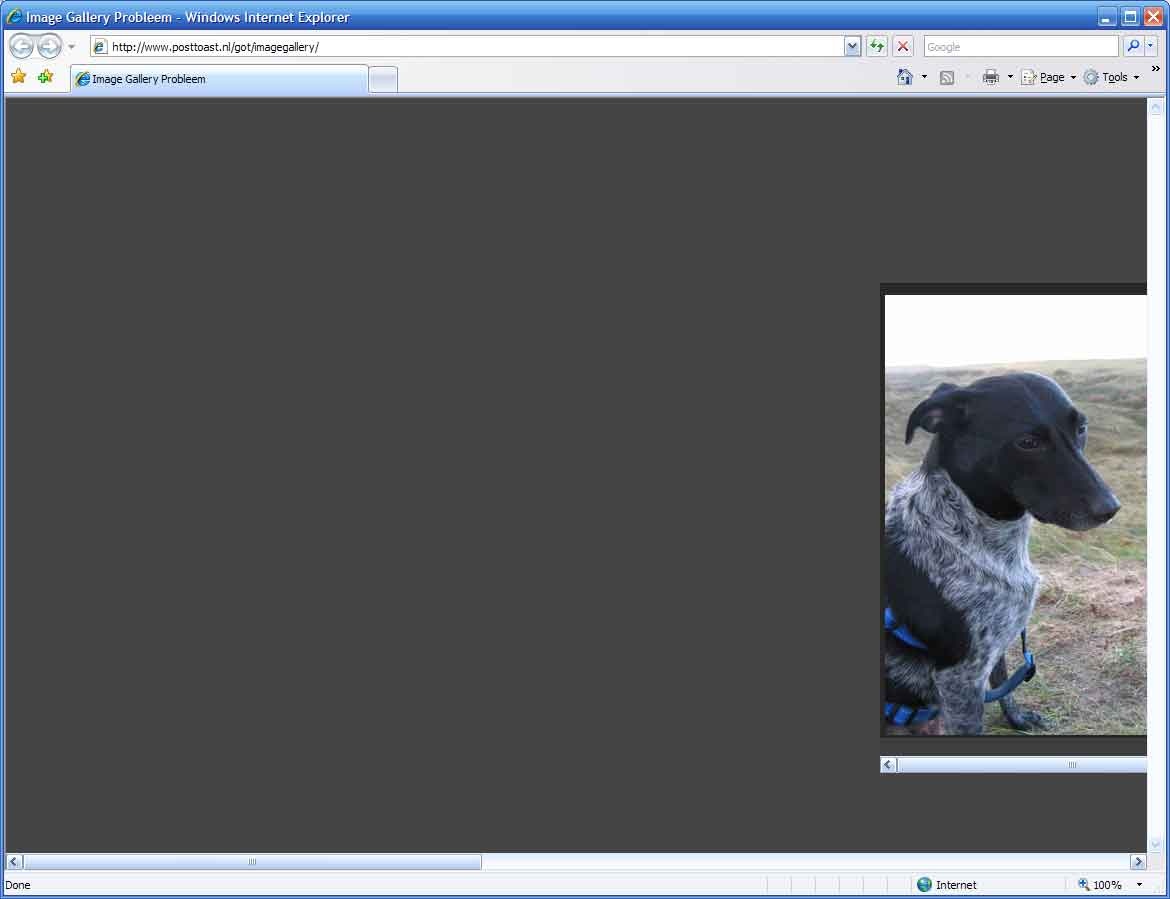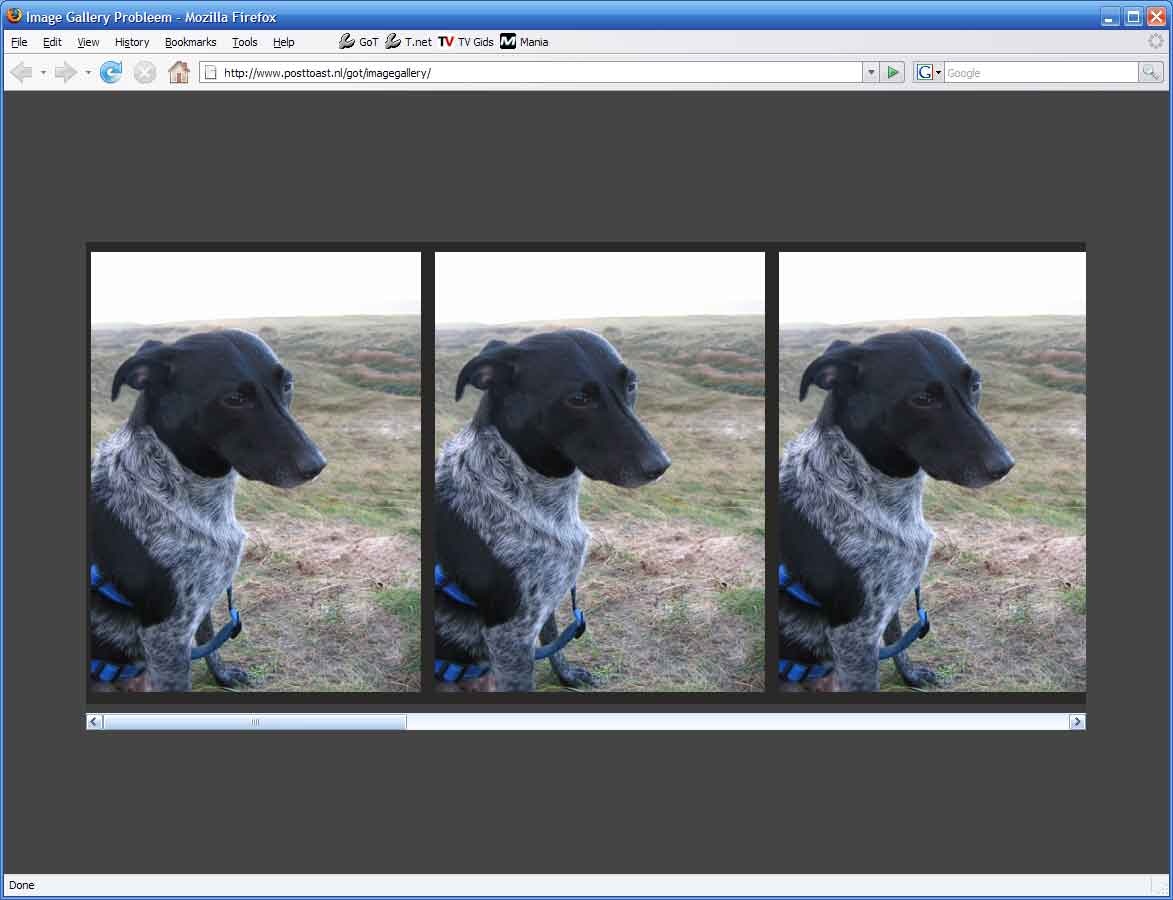 Nee, dit is niet het zoveelste "hoe-zet-ik-mijn-pagina-in-het-midden" topic, dit is een andere vraag. Ik heb een simpele image-gallery gemaakt bestaande uit een rij met foto's achter elkaar. Dit blok is 1000 pixels breed en moet in het midden van de pagina staan. Als de inhoud breder is dan 1000 pixels moet er in het blok een scrollbar verschijnen. Dit werkt perfect. In Firefox... Internet Explorer 6 en 7 zien het net even anders en doen iets heel vreemds. Zie dit voorbeeld.