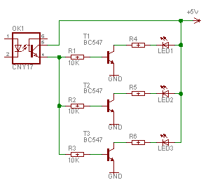 Aan OK1 hang je je moederbord (+ op 1, - op 2), en ipv led1..3 gebruik je je musketeer, sunbeam en normale led