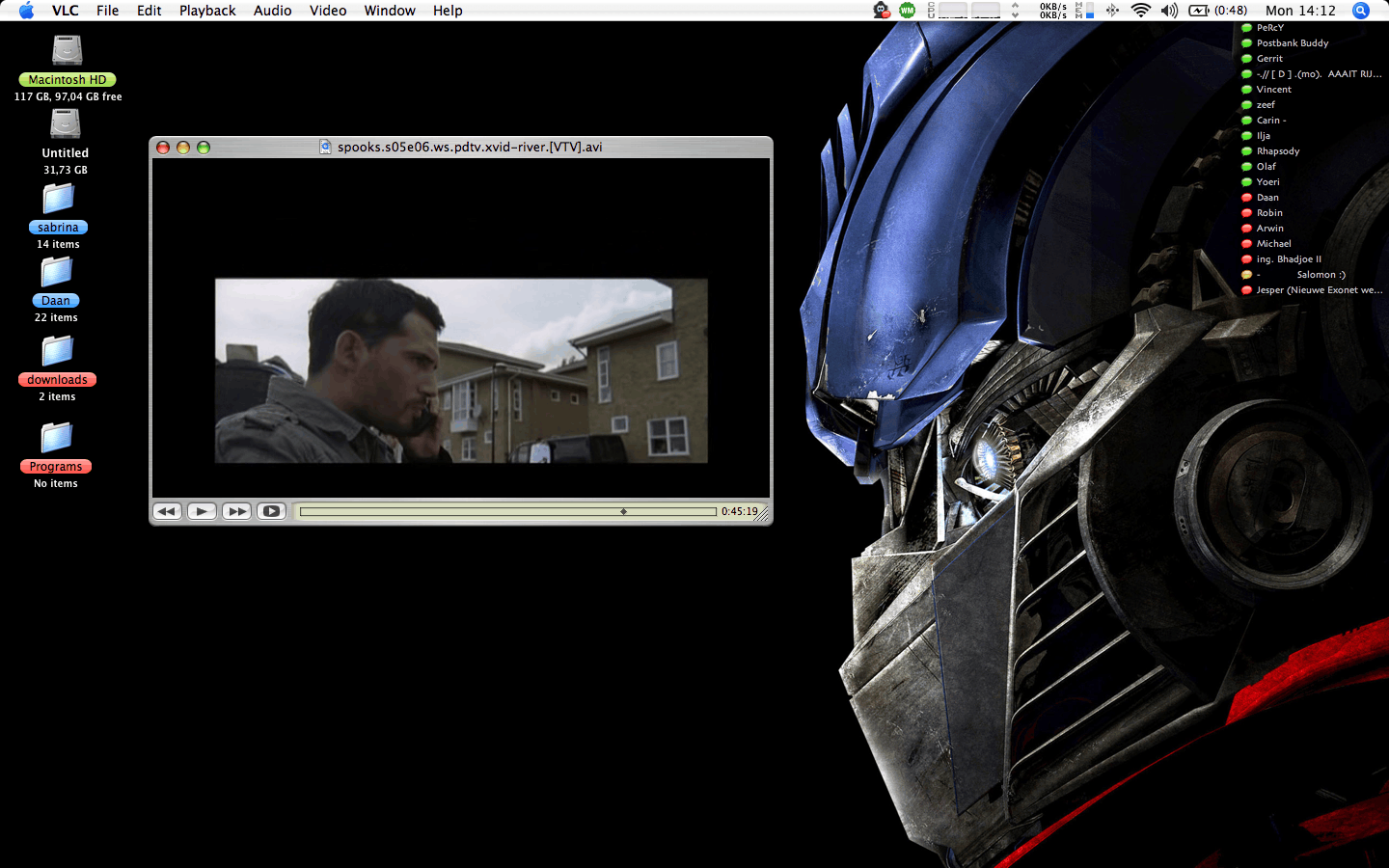 Dock items (behalve de standaard meuk): Photoshop, Dreamweaver, Transmit, Transmission, World of Warcraft, MSN Messenger, Age of Empires III, Skype, Word, Overflow,