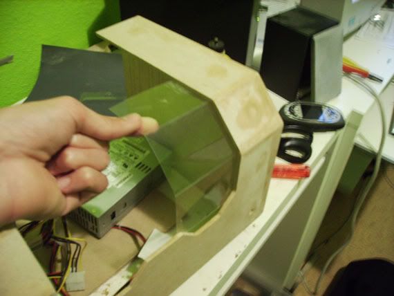 De case wordt niet precies hetzelfde zoals in het spel. De zijkanten vind ik een beetje te ingewikkeld/raar, daarom heb ik er iets simpelers van gemaakt. Aan één zijkant komt een 80x80mm koeler. Onder het moerderbord komt de slot-in DVD-speler en een hardeschijf. De hardeschijf wordt gekoeld door twee 40x40 koelertjes aan de onderkant/zijkant. Onder het moederbord komt ook nog een 200 Watt voeding uit een Shuttle SN41G2. (Het wordt nog druk daar