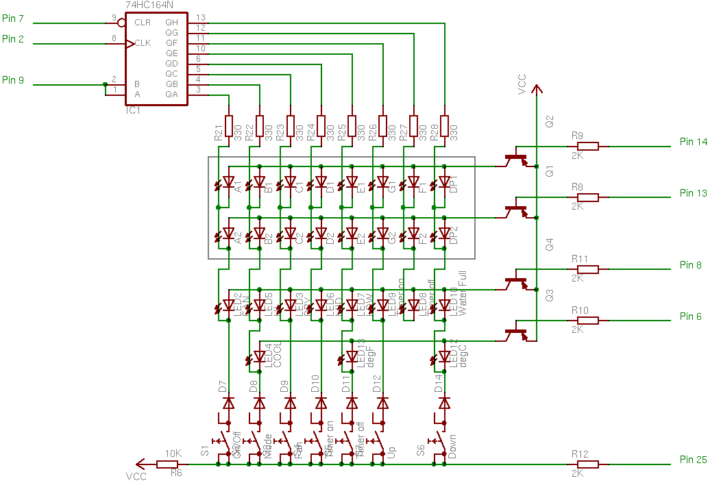 Na een hoop meetwerk ben ik erachter hoe het bedieningspaneel in elkaar zit.Alle ledjes, het display en de knoppen zitten multiplexed in 1 groot raster.