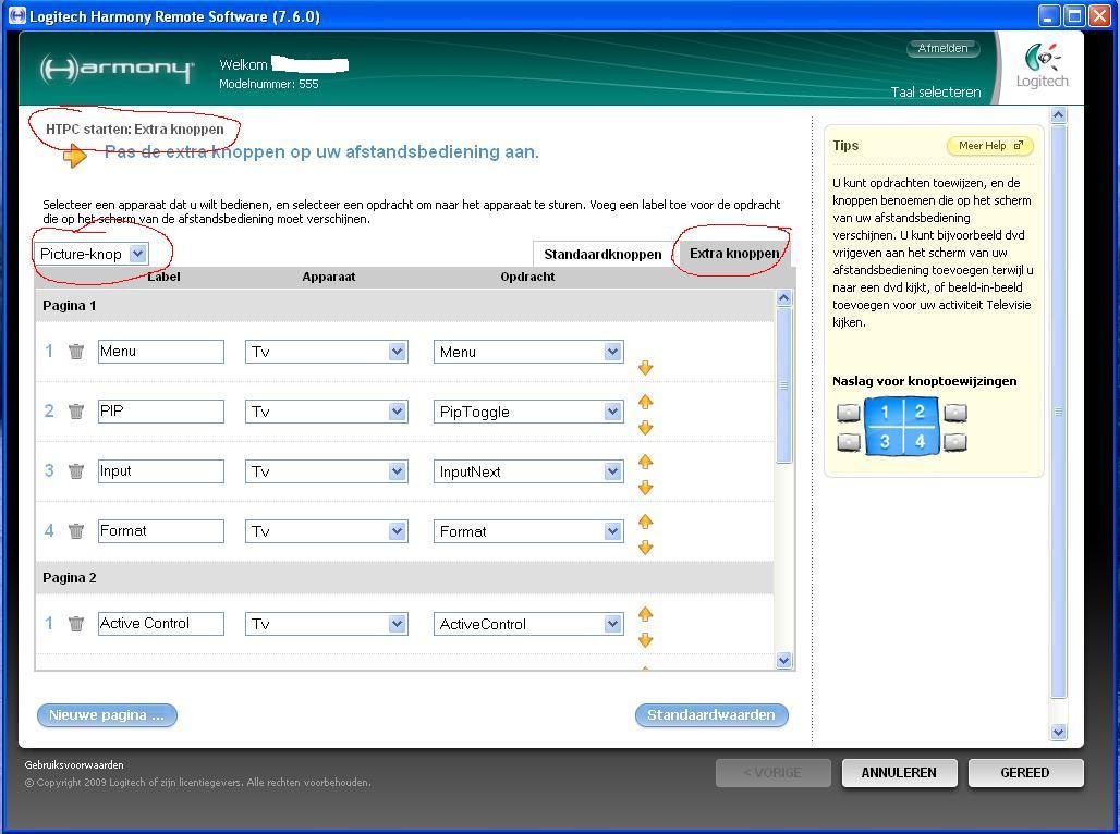 Het lag aan de uitgangsactiviteit die ik had gekozen voor het aanmaken van een nieuwe activiteit. Het ging trouwens niet om "TV Kijken", maar om "HTPC starten". De gekozen uitgangsactiviteit was toen MP3 luisteren, terwijl ik me later bedacht had en ook TV wilde gebruiken binnen deze activiteit. Daarom wilde de Picture knop niet werken. MAAR, wat ik onlogisch vond in de software, is dat je als gebruiker toch nog een TV als apparaat aan de activiteit MP3 luisteren kan toevoegen en gewoon toegang hebt tot de optie Picture knop. Geen wonder dat je als gebruiker dan denkt dat je daar de instellingen van kunt veranderen. Maar wat je ook verandert, het kan toch niet op je remote tevoorschijn worden gehaald met de Picture knop omdat je in het begin van het aanmaken van de activiteit voor MP3 luisteren hebt gekozen, en daar heb je geen TV en dus geen Picture settings voor nodig. Dat is op zich logisch, maar dan hoort Logitech die opties in de software op dat moment ook niet toegankelijk te maken, vind ik.