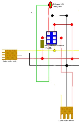 De grote tuimelschakelaars werken als 12v/uit/5v voor de fans en de kleine als aan/uit voor de LED's.