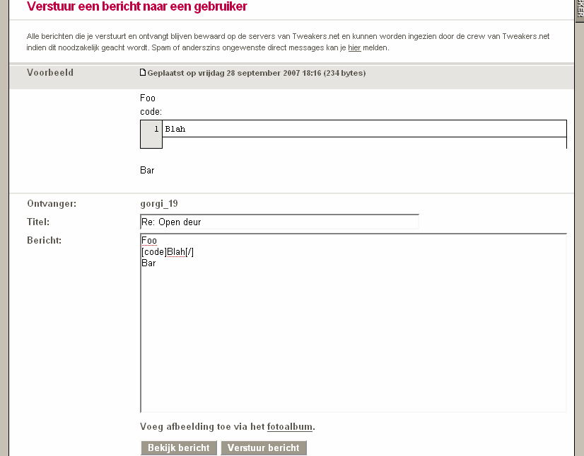 Als ik code post in een DM dan doet 'ie raar, maar alleen bij 'bekijk bericht' (preview). Als ik 'm post is het goed. Dit gaat ook 'fout' bij meer dan 1 regel code.