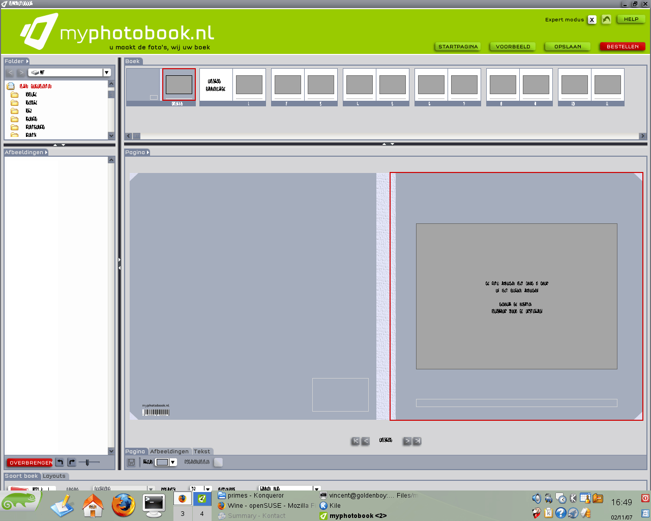 Ik wilde een foto-album maken van mijn vakantie via de HEMA en uit http://www.digiplace.nl/pivot/entry.php?id=525 maakte ik op dat het me wel met linux via wine zou lukken. Ik kreeg na de installatie alleen een leeg venster te zien en er gebeurde niks. Nu kreeg ik via http://www.myphotobook.nl/index.php?start de installatie wel werkende (het lijkt op het eerste gezicht erg op de HEMA-software) maar het werkte niet: