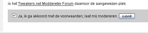 - Na deze te hebben doorgelezen staat er een checkbox met de text "Ja, ik ga akkoord met de voorwaarden; laat mij modereren" onder aan die pagina, die aangevinkt en op submit gedrukt.