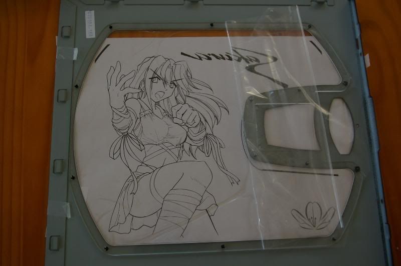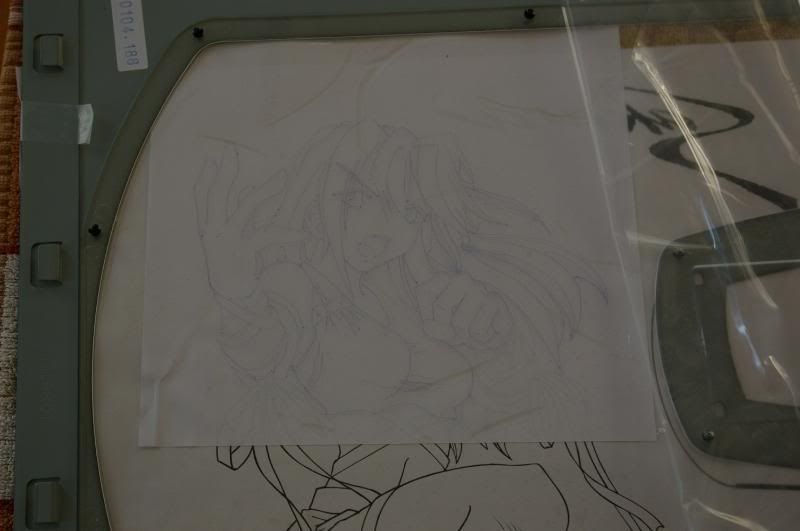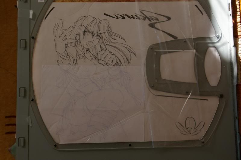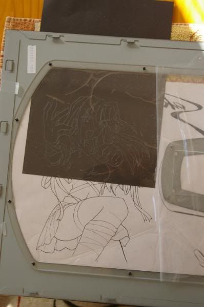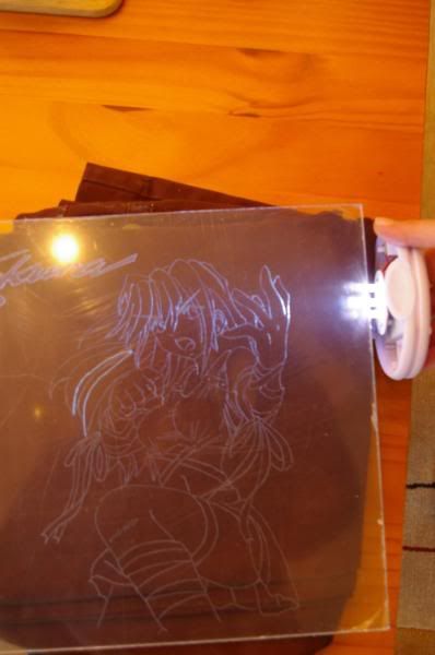 Na tevreden te zijn over het proefresultaat met het echte werk begonnen. Eerst met niet watervaste stift de bovenste helft nagetekend/overgetrokken. Bewust niet watervast, omdat je toch best een groot probleem hebt met de dikte van het plexiglas, en je niet consequent exact recht boven je afbeelding kan zitten en daardoor dus vertekend beeld krijgt.Je kan dus na het overtekenen nog het een en ander aanpassen. Nadeel van niet watervaste stif is weer dat je heel erg uit moet kijken dat je tijdens het vrezen niet de afbeelding uitveegt.