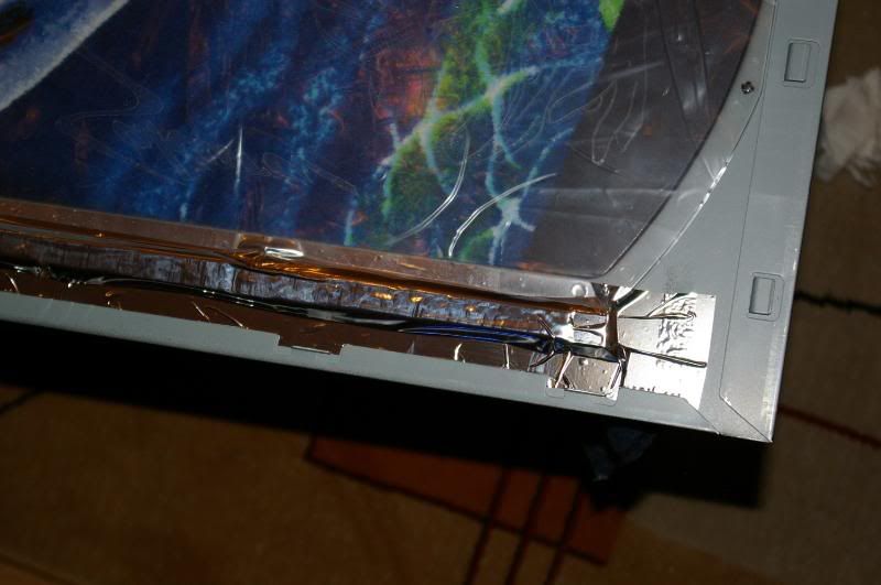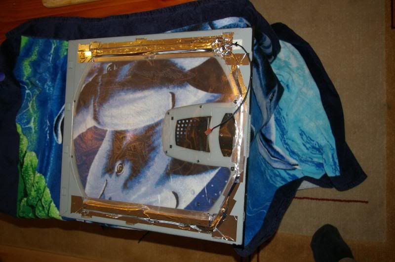 En na het vastzetten afgedekt met aluminium tape, ik wil zo min mogelijk strooilicht hebben, en zoveel mogelijk richten op de zijkanten van het plexiglas, het spiegelende oppervlak van het aluminiumtape stuurt zoveel mogelijk licht de zijkant van het plexiglas in.