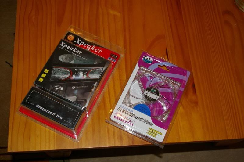 En ja hoor, weer de deurbel, de postbode. De laaste onderdelen voor mijn pc zijn ook binnen, mooie 12cm blauw verlichte fan en de lang verwachte en blijkbaar toch nog moeilijk leverbare Xpeaker. (later heb ik er nog een 12mm fan bijgehaald voor de vervanging van die standaard fel oranje fan)
