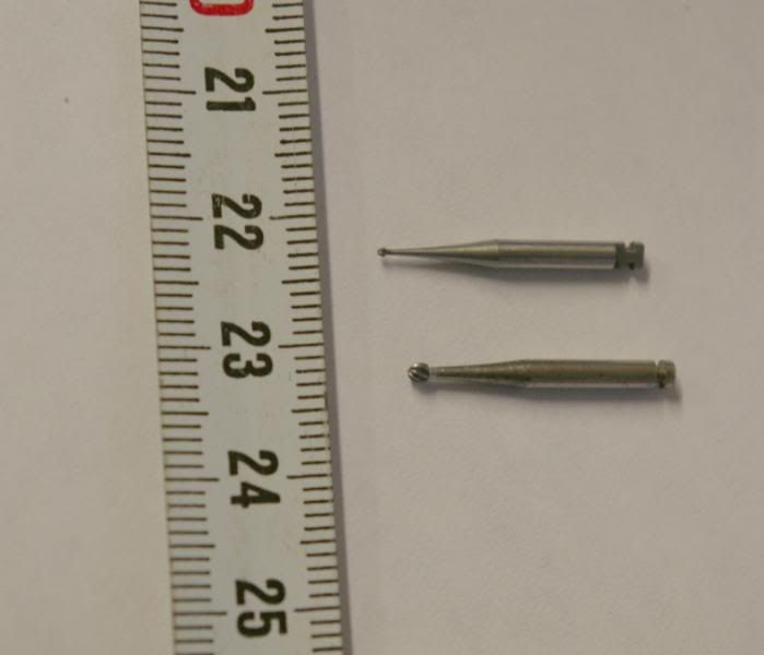 Eerst fiks oefenen op wat afvalstukjes plexiglas met verschillende maten vreesjes. Uiteindelijk gekozen voor een bokop vreesje van 1,5mm voor het uitzetten van de afbeelding, en een bolkop vreesje van 0,5mm voor het uitdiepen van de afbeelding. Ik heb het ook nog met een driehoek vreesje geprobeerd, maar daarmee was het zeer moeilijk om te sturen en netjes in de uitgezette afbeelding te blijven. De reden om het eerst met een groter vreesje uit te zetten is dat je daarmee mooiere glooiende lijnen kan maken.