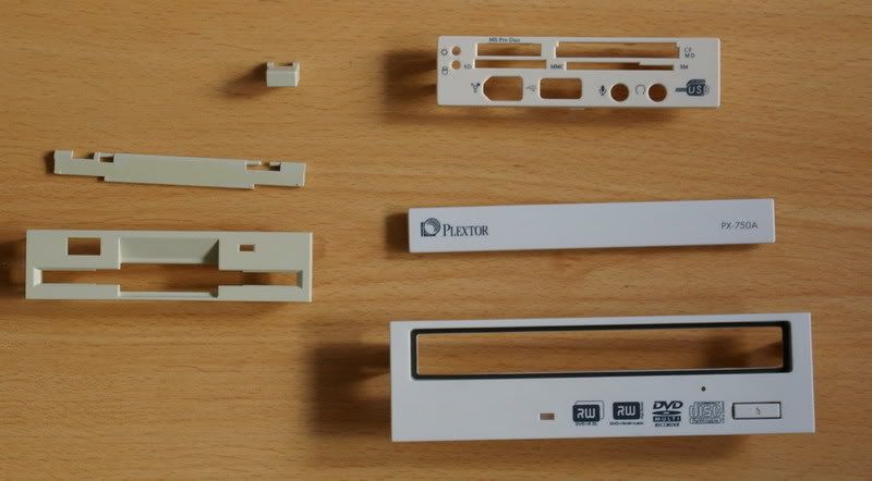 De DVD brander en de card reader vinden straks weer een plaatsje in de nieuwe pc, maar dan met hun zwarte frontjes. De ledjes in de cardreader moeten plaatsmaken voor blauwe uitvoeringen.