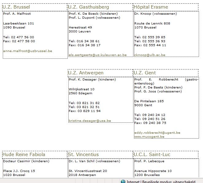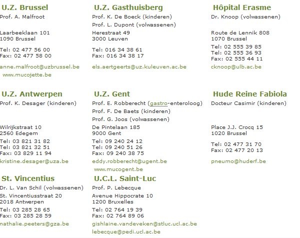 | <dl> <dt>U.Z. Brussel</dt> <dd><p>Prof. A. Malfroot</p> <p>Laarbeeklaan 101<br />1090 Brussel</p> <p>Tel: 02 477 56 00<br />Fax: 02 477 58 00</p> <p><a href="mailto:anne.malfroot@uzbrussel.be">anne.malfroot@uzbrussel.be</a><br /><a href="http://www.mucojette.be" rel="external"></a></p> </dd> <dt>U.Z. Gasthuisberg</dt> <dd><p>Prof. K. De Boeck (kinderen)<br />Prof. L. Dupont (volwassenen)</p> <p>Herestraat 49<br />3000 Leuven</p> <p>Tel: 016 34 38 61<br />Fax: 016 34 38 17</p> <p><a href="mailto:els.aertgeerts@uz.kuleuven.ac.be">els.aertgeerts@uz.kuleuven.ac.be</a></p> </dd> ... </dl> |
