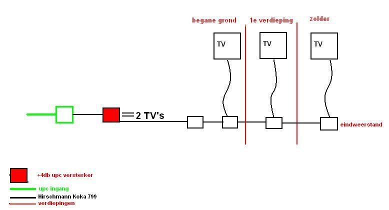 Wat te doen?Ik heb net ff gekeken wat voor kabels er gebruikt zijn: Hirschmann Koka 799 en er hangt een +4db versterker van UPC nu tussen.. met 4 poorten waarvan er 3 gebruikt worden. 1tje is niet afgedopt.