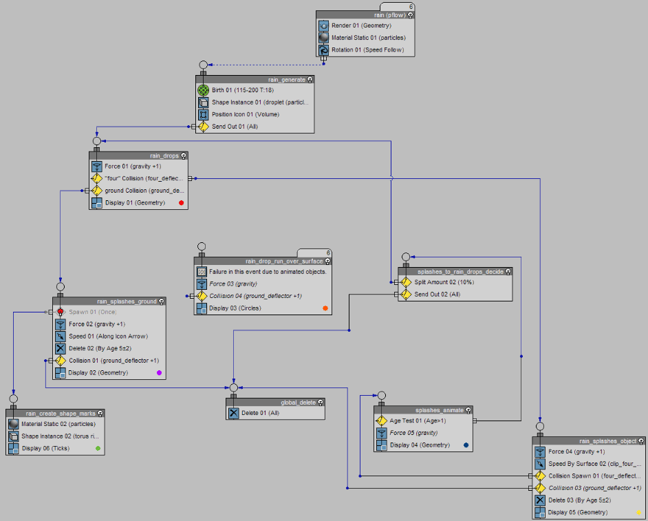 Hallo ik kwam net iets tegen wat me nog nooit gebeurt is.. Ik zit hier te werken aan wat regen in particle flow. Wat hij doet is de particles die geboren worden verplaatsen naar een event die helemaal niet is gelinkt dus waar geen valid pad naar is (check de particle count maar in het gifje)...