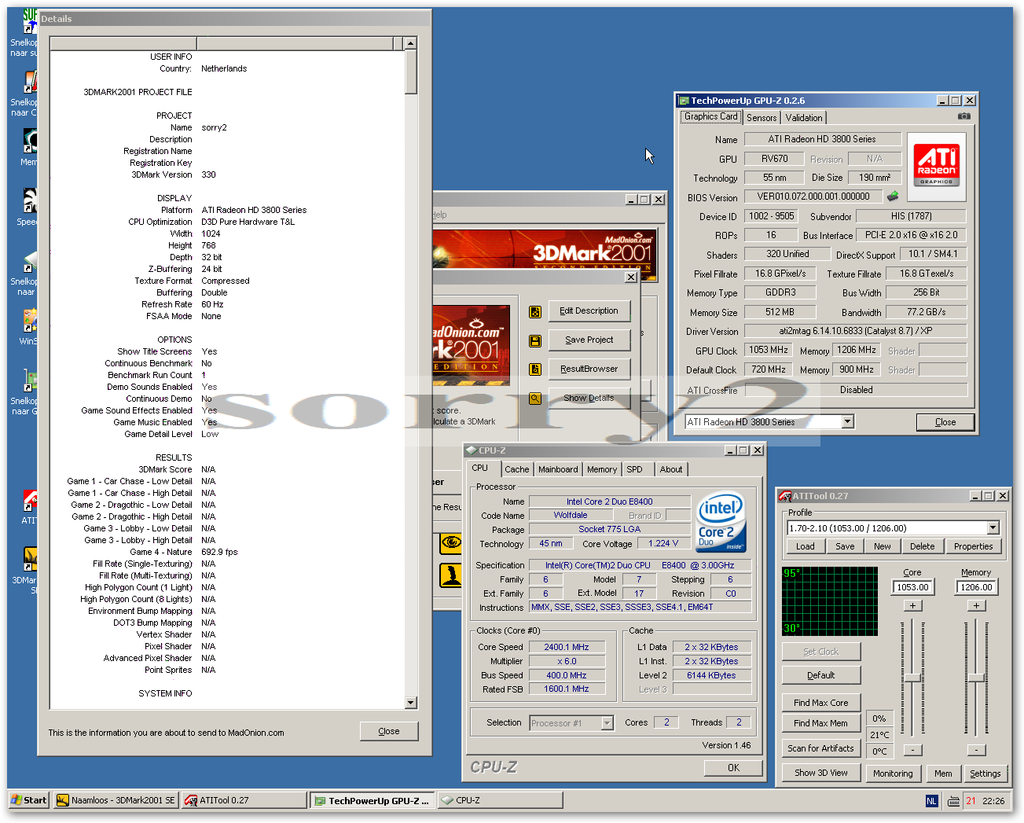 Dit zijn allemaal normale HD3850's. Ik zit hier met een leipe OC-edition die stock 720/900 draait. Met OC kom ik 3DMurk-stable niet veel verder dan 750/1035 ofzoiets terwijl er een Zerotherm (fokking 100%)-koeler opzit. Wat doe ik dan verkeerd?