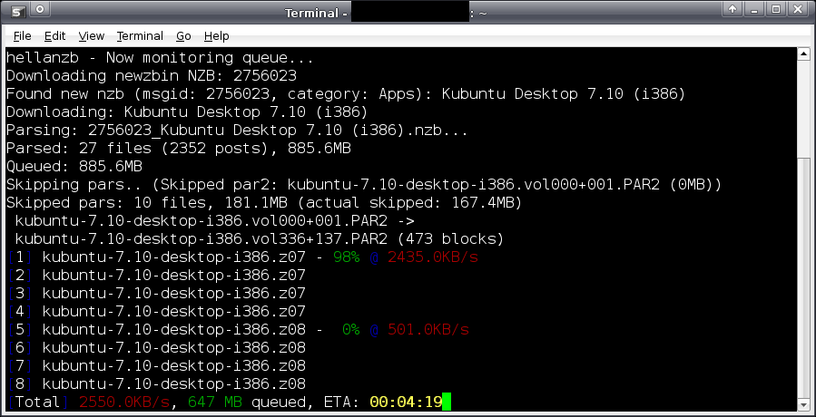 ), maar welgeteld één keer moest ik voor m'n werk iets mbt Usenet testen. Daarvoor heb ik een oude P2-400 gepakt die we hadden liggen, Linux erop gekwakt en Hellanzb geinstalleerd omdat ik er goede dingen over las en het bovenal *simpel* was, dus geen poespas en het werkte over SSH (command line). Overigens is het niet 'pure' commandline. Dankzij ncurses (een library die het mogelijk maakt om simpele ASCII-graphics en menus in een text console te tonen, zie