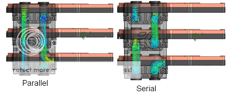 Wat je GPU blok betreft, het wil zeggen dat je zowel aan de onderkant als aan de bovenkant een fitting in je blok zetten kunt. Je kunt er dus een 'SLI' koppeling tussen maken.