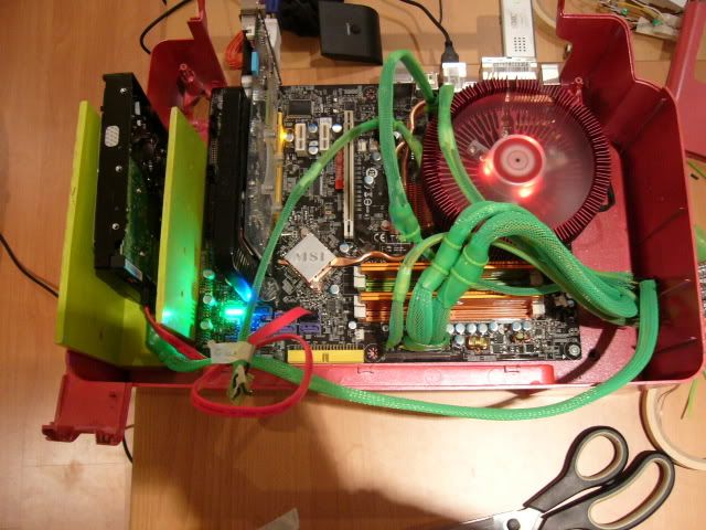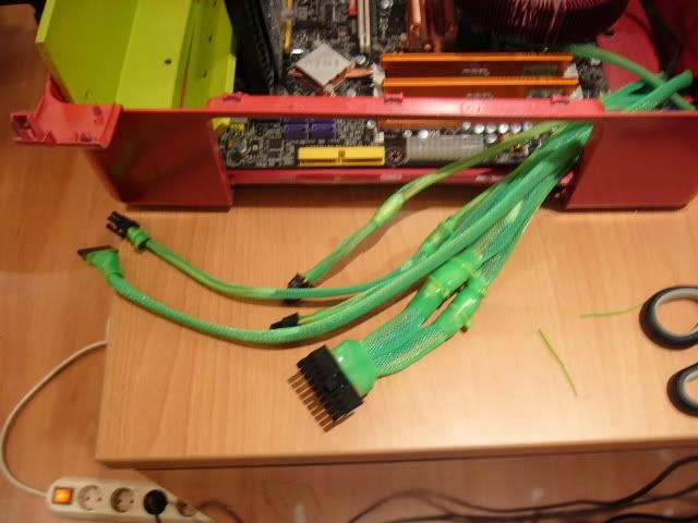 Het rood komt op de foto's hier (op goed gekalibreerde schermen) nogal mat en oranje(-achtig) over en dan in combinatie met appelgroen en de sleeving geeft een hele rare regenboog van kleuren. (Zie ook je eerste foto van bovenstaande post en let dan ook op de oranje kleur van je heatspreaders op je geheugen)