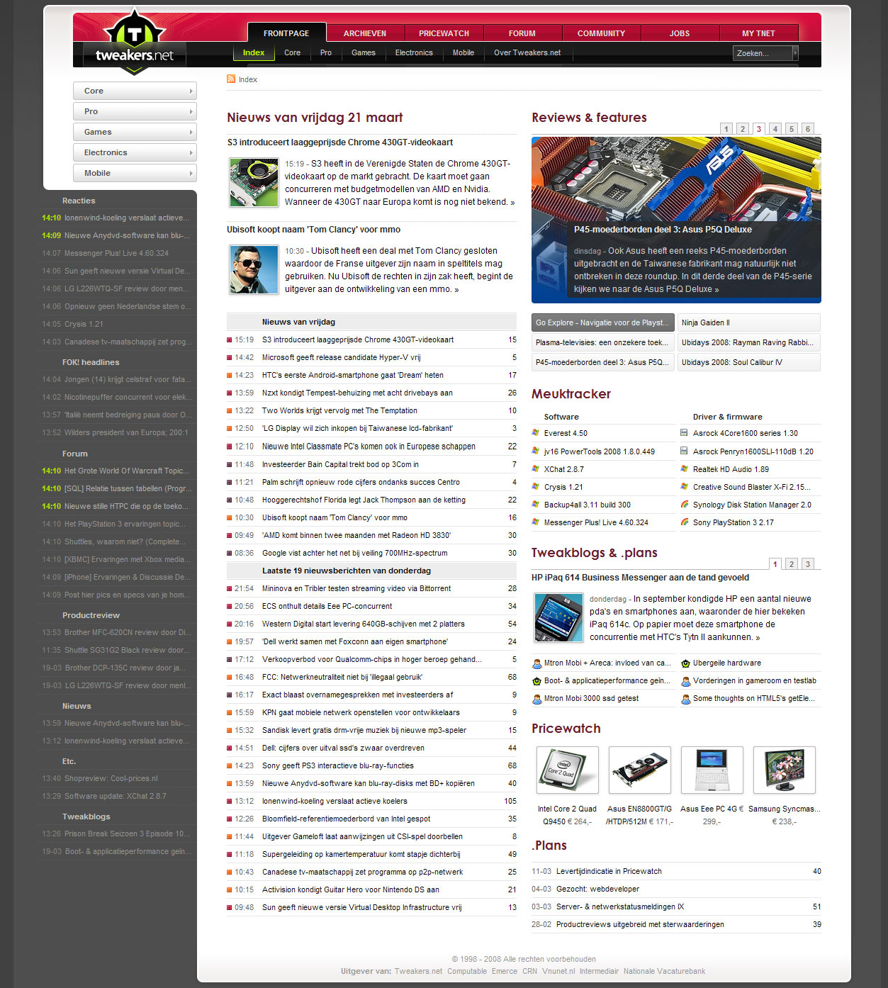 Uitgaande van dit plaatje: http://tweakers.net/ext/i/1214836406.jpg ben ik zo vrij geweest eventje de witte randen te verkleinen. Op de NGv1 page 'klopt' de header, lekker strak. Bij NGv2 zoals jullie die van plan zijn, kapt de header ineens af voor mijn gevoel door de extra witruimte. Bovendien loopt de witruimte helemaal door tot onderaan, wat voor mijn gevoel niks toevoegd en alleen maar extra witruimte kost. Daarom zou ik deze wijziging aan jullie voor willen stellen: