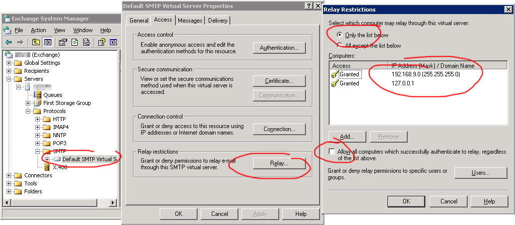 Disable open relaying on all SMTP virtual servers. The default relay restrictions prevent unauthorized users from using your Exchange server to send mail to external locations. If your server is open for relaying, unauthorized users can use your server to send spam. As a result, your server may become known to other organizations as a source for open relay and, as a consequence, blocked from sending legitimate mail.
