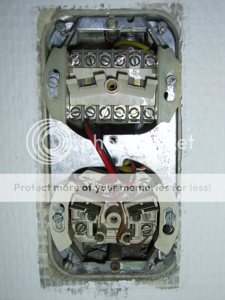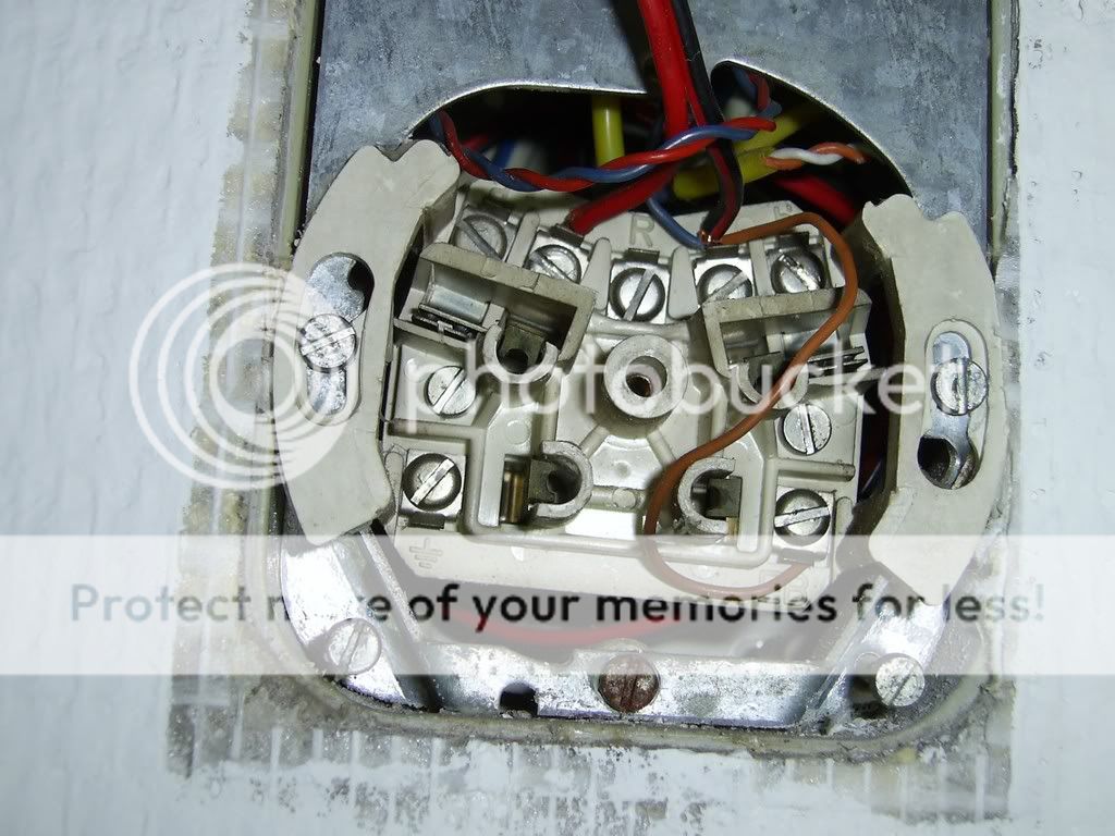 Vervolgens heb ik de blauwe en rode draad helemaal losgemaakt en rechtstreeks in een (door alice bijgeleverde) wandcontactdoos geschroefd. Ik weet niet precies (zeker) wat A, B, A' en B' inhoud, maar de rode draad zit op de linker buitenste en de blauwe op de rechter buitenste. Als ik me niet vergis zijn dit de enigen die ook gebruikt worden.