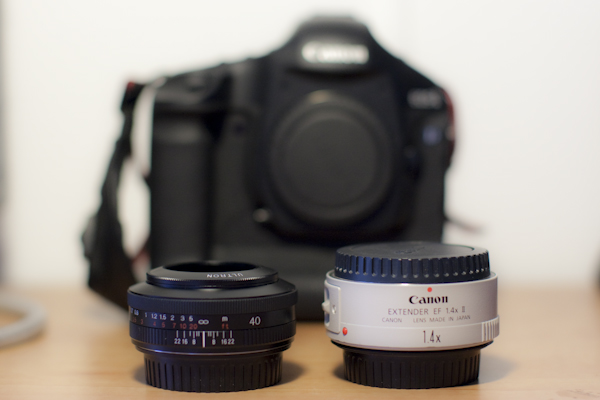 Even om aan te geven hoe ontzettend compact die lens is: even naast mijn Canon 1.4 extender gezet (voor de vergelijking)