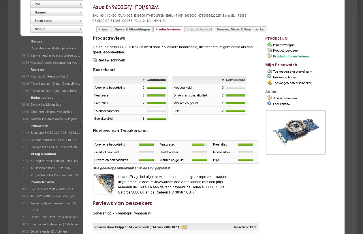 Er is een reviews: Drie goedkope videokaarten in de ring geplaatst geschreven over o.a. de Asus EN9600GT/HTDI/512M. Daar is een simpele review van gemaakt: productreview: Asus EN9600GT/HTDI/512M review door Hielko Om de review wellicht (ik weet het natuurlijk niet zeker of dat ook echt de reden is) toch mee te laten tellen voor de overall score in de review overzichtpagina. Waarbij ook nog eens een reactie van een user is die dacht dat er geen uitgebreide review van de simpele review schrijver...