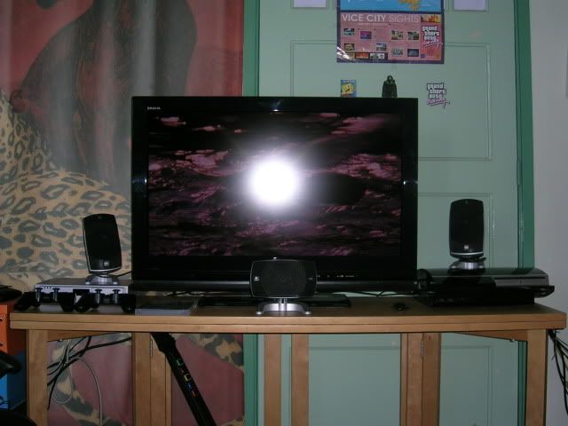 En een foto genomen vanaf mijn bed. Zoals je ziet is de luisterpositie goed als je kijkt naar de opstelling van de speakers. Maar de tv staat naar rechts, maar ik kan er mee leven…