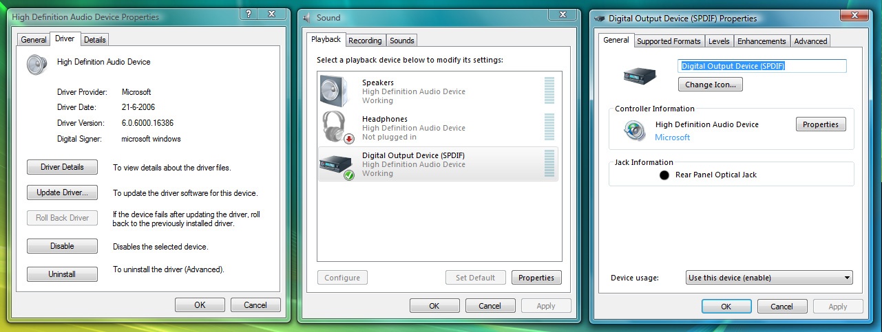Alleen zoals je op de twee screenshots kunt zien noemt Vista speciek de aansluiting "Achterpaneel Optische stekker", dat is wat verwarrend.