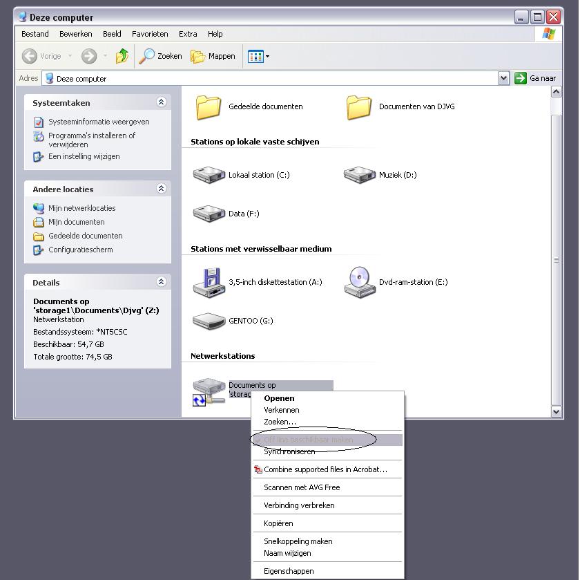 Maar nu zit ik met een rare irritante melding, hij wilt continu synchroniseren, maar dat wil ik niet, mijn vaste desktop heeft een directe, continue verbinding met de nas, en "Offline beschikbaar maken" moet dus gewoon uitstaan, maar dat kan niet zoals te zien is op de screenshot hieronder: