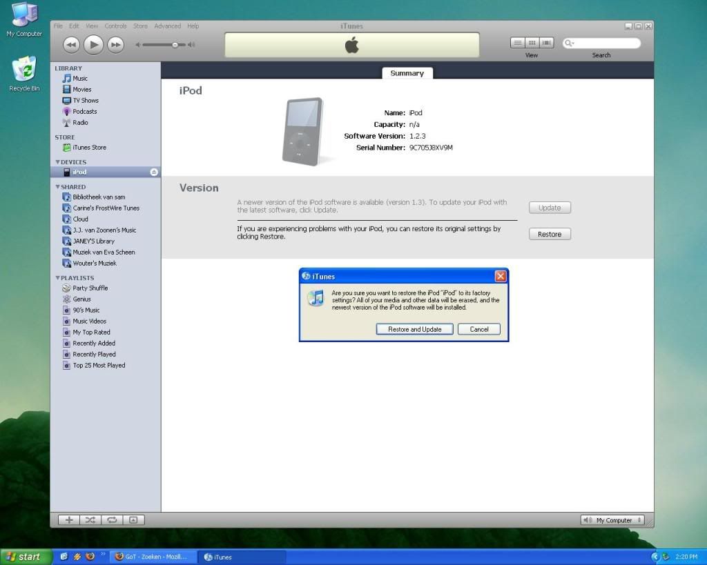 Daarna kan iTunes nog steeds de iPod niet lezen en bovendien lijken alle nummers van mijn iPod verdwenen. Ik hoop dat dit laatste niet het geval is, maar hoe dan ook: ik wil eigenlijk de Restore functie (zie plaatjes hieronder) van iTunes niet gebruiken, omdat hij dan waarschuwt dat ik alle data kwijt ga raken, dus 27gb aan onvervangbare nummers.