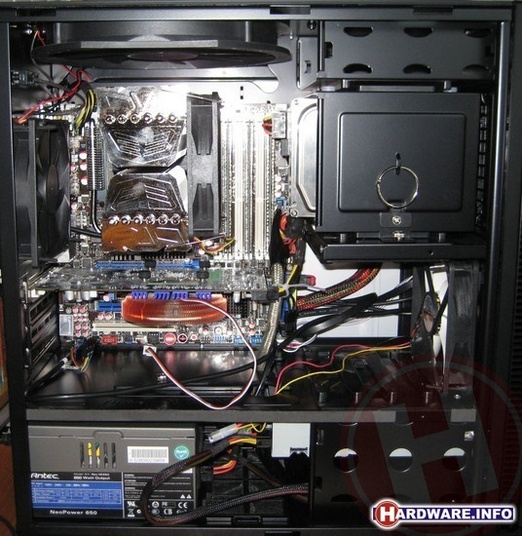 Ik heb sinds vorige week een Intel Core i7 920 d0 met een Asus Rampage II Gene. De Intel wordt gekoeld door een Prolimatech Megahalems. Nu krijg ik de temps niet echt netjes onder controle. De set zit in een Antec P180 mini met die grote fan boven (200mm?) een 120mm Nexus Fan voor én achter op stock voltage. Op de Prolimatech heb ik de Antec fan gezet gestuurd door de externe fancontroller.