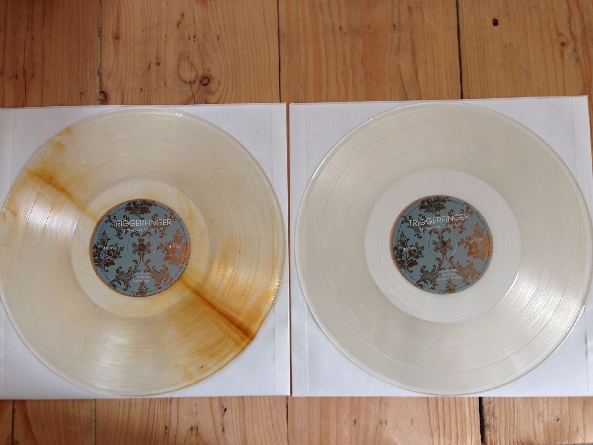 Bij één plaat had ik zelfs een soort van gruis op de plaat. Een sticker op de hoes waarschuwde mij al daarvoor. Het label waarvan ik 'm kreeg doet alleen maar in exclusief vinyl, dit was een soort 'swirl' effect. Dat laat schijnbaar een zanderig residu achter. Maar buiten wat minimale kleine krasjes was er niets aan de hand.