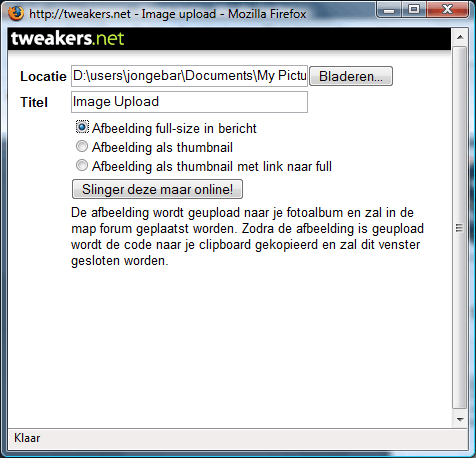 Daar vul je een naam van het plaatje in, en ga je hem uploaden. Helaas is het in firefox nog steeds zo dat de url niet direct naar je clipboard geplaatst kan worden. (Waarom is dat eigenlijk nog steeds?)