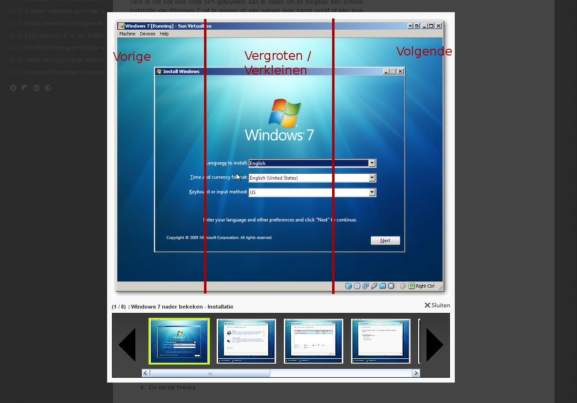 Ik had een suggestie die te maken had met de browsen van de afbeeldingen. Zou het niet handig zijn als je op de afbeelding kan klikken om naar de volgende of vorige afbeelding te gaan? Dit zou je kunnen doen door de een kant bijv. de rechterkant (33%) van de afbeelding te reserveren voor "volgende", de linkerkant (33%) voor "vorige" en het midden (resterende 33%) om de afbeeldingen te vergroten of te verkleinen.