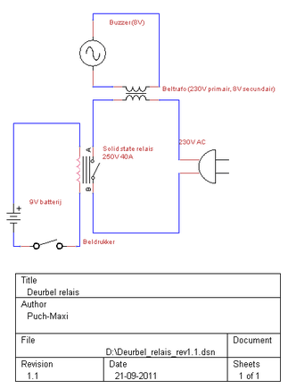 Het idee is dat ik op geen enkele manier 230V op de beldrukker wil hebben, we hebben een aardige postbode en die wil ik nog een tijdje houden. Vandaar het relais, willen jullie er eens op schieten? (Misschien dat ik beter gewoon een bel op batterijen kan nemen, maar met transformator geeft hij net even meer 'Oempf')