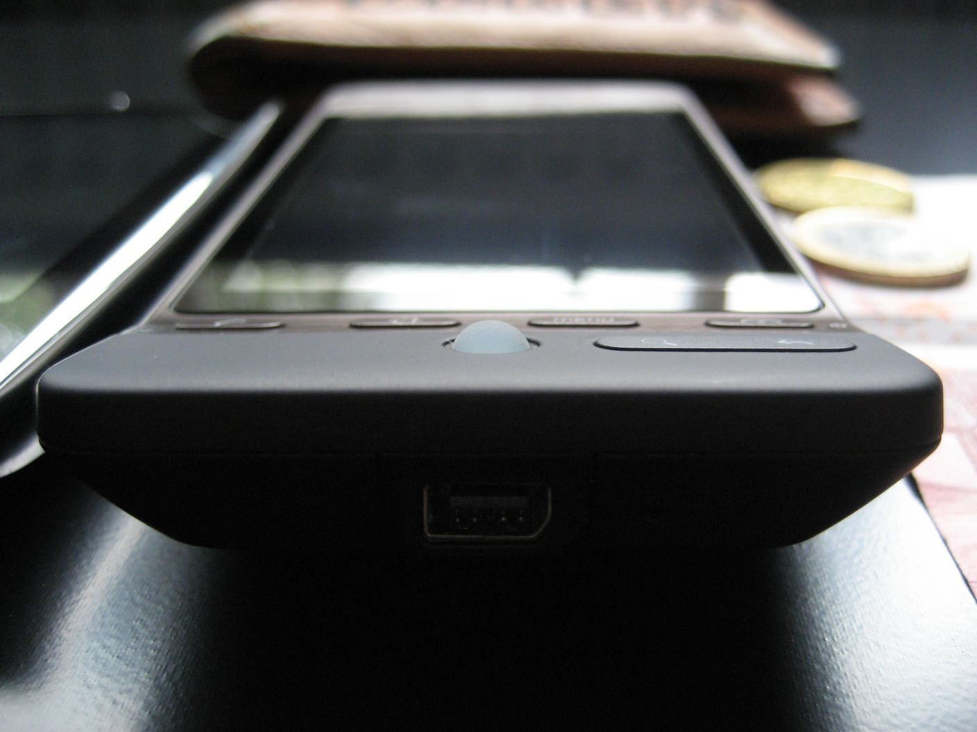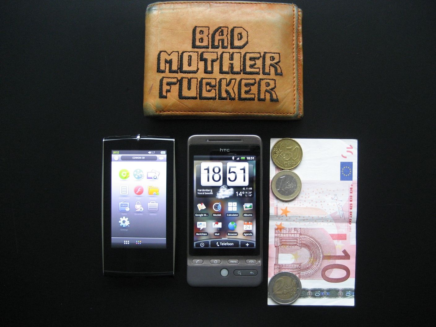 Wat vergelijkingsmateriaal om de grote te bepalen van de Hero. Portemonnee bovenaan, Cowon S9 links, Euro's rechts. En nog een paar foto's van de Hero in mijn hand (normaal formaat