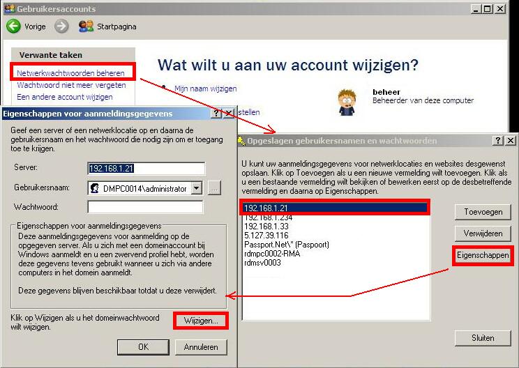 Onder XP ken ik onder de gebruikers accounts, de functie "Netwerkwachtwoorden beheren". Daar kan ik eventueel foutief ingezette netwerkwachtwoorden aanpassen of verwijderen. Hier heb ik het probleem onder XP mee opgelost.