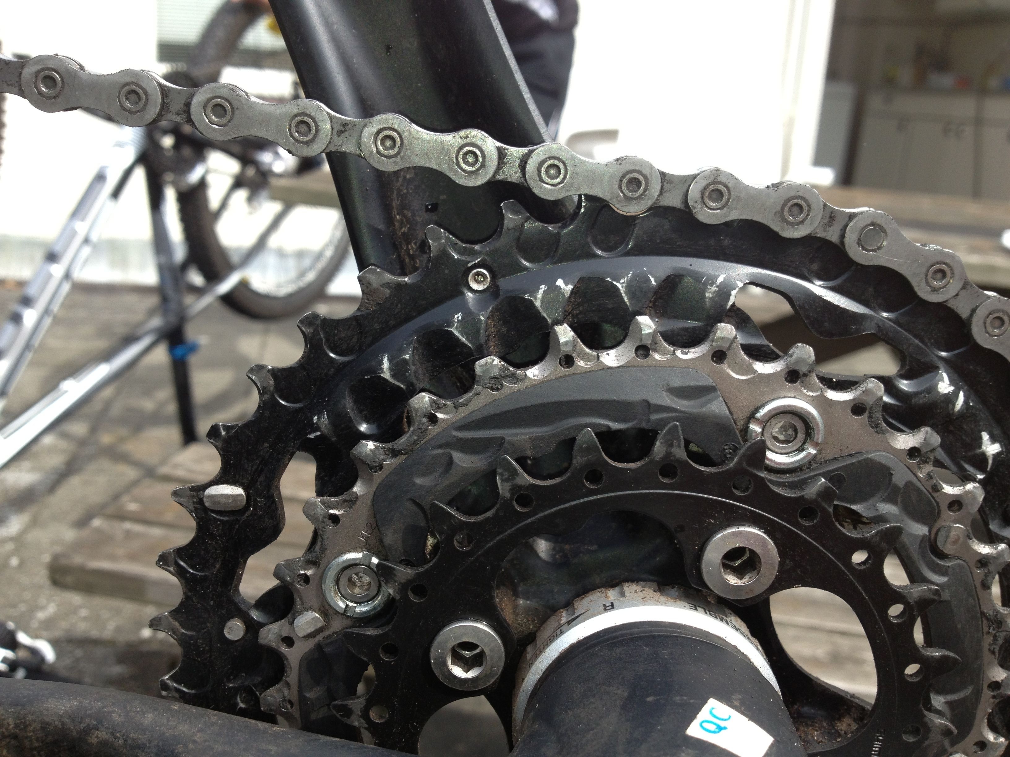 Je kleine blad is zo te zien wel wat versleten, je middenblad ook iets. Als ze nieuw zijn, zijn de 'halve' tanden net zo hoog, maar zijn de tanden symmetrisch. Zeker bij jouw granny zijn de tanden aardig asymetrisch geworden. Niet dat je daar last van hebt, maargoed.