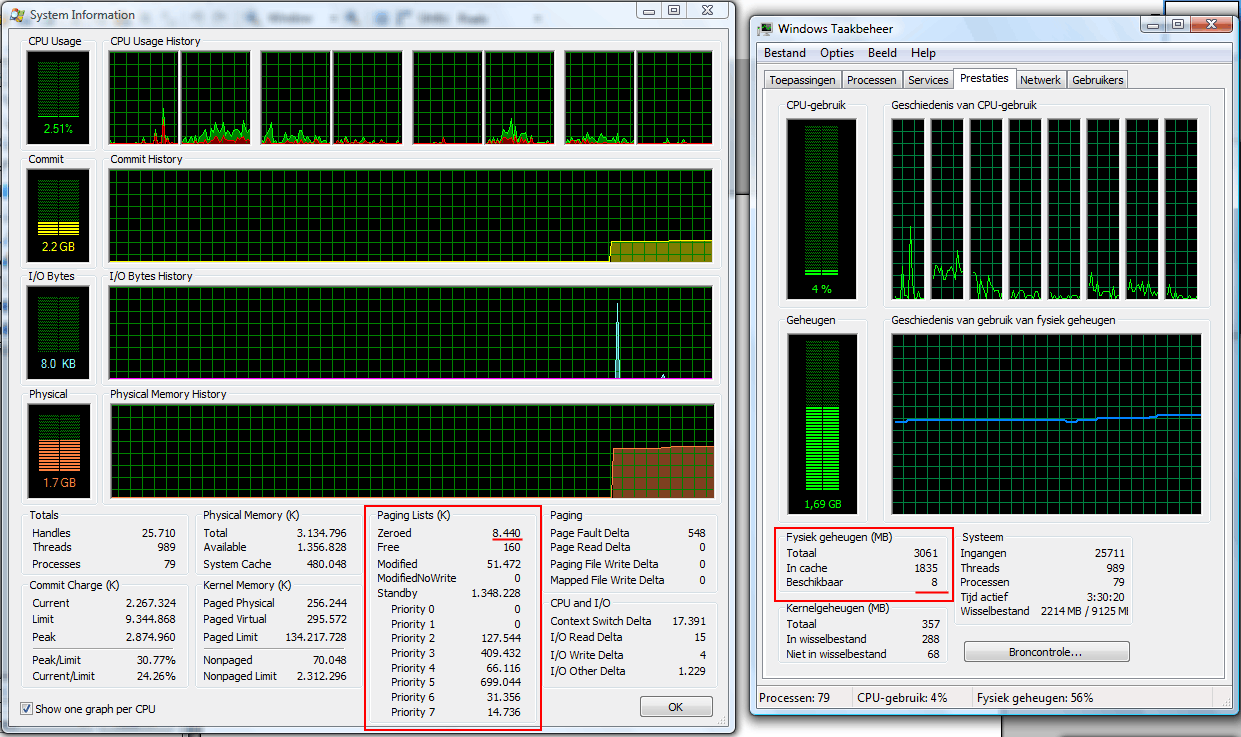 ik heb sinds gisteren mijn nieuwe pc geinstalleerd, en ik moet zeggen dat mijn verwachtingen niet waar werden gemaakt. Het betreft een HP M9751 met Core i7 en 6Gb DDR3. Ik vond dat de pc erg traag was, en schoof het op het indexeren wat vista moet doen. Nu kwam ik aan het kijken in de taskmanager, en tot mijn verbazing is het beschikbare fysiek geheugen bijna leeg!