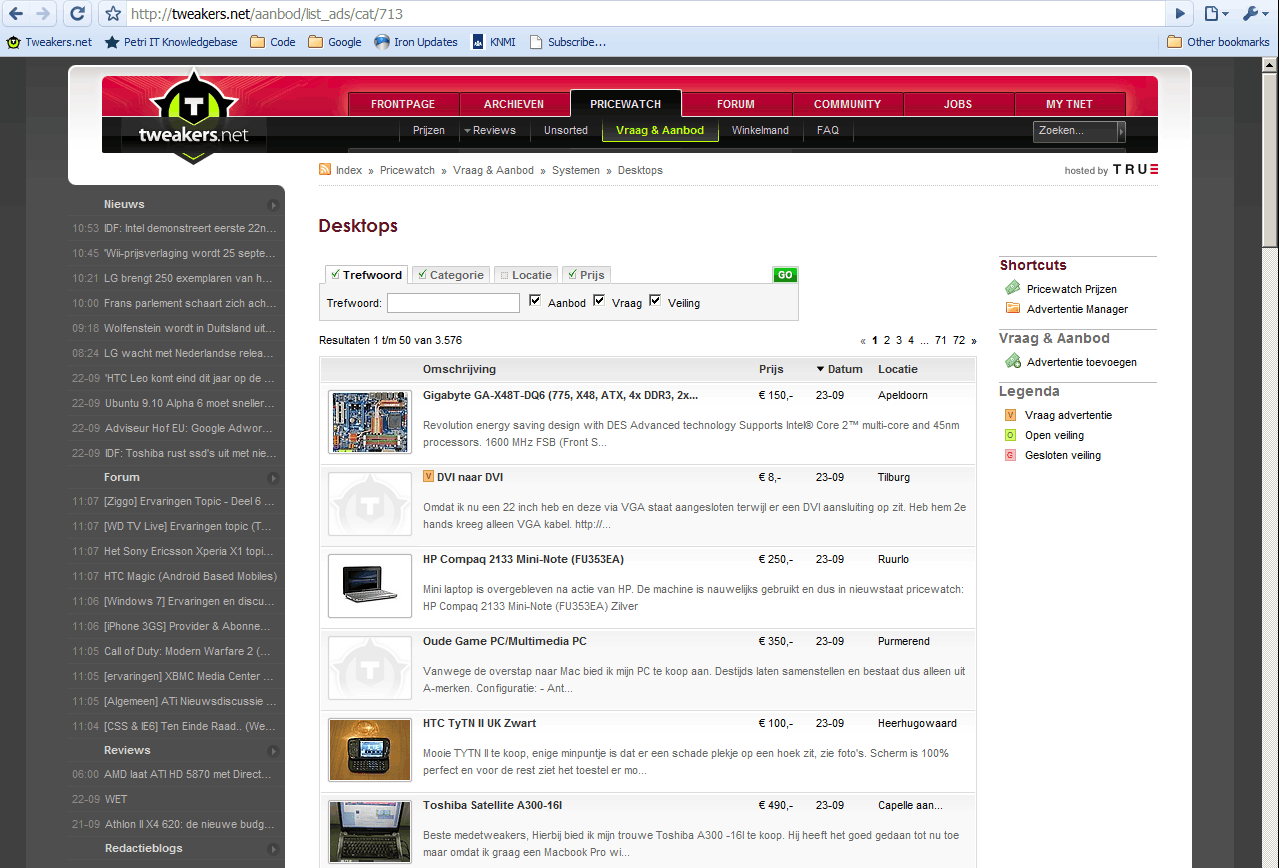 Ik kijk regelmatig op Vraag en aanbod en gebruik dan de categorieën om specifieke nieuwe advertenties te bekijken. Sinds vandaag werkt die filtering echter niet meer zoals het hoort, want bijvoorbeeld in de desktop categorie komen ook moederborden, netbooks en telefoons voor. Ik heb het getest met Internet Explorer 8.0.6001 en SRWare Iron 3.0.197.0, bij beide krijg ik hetzelfde resultaat.